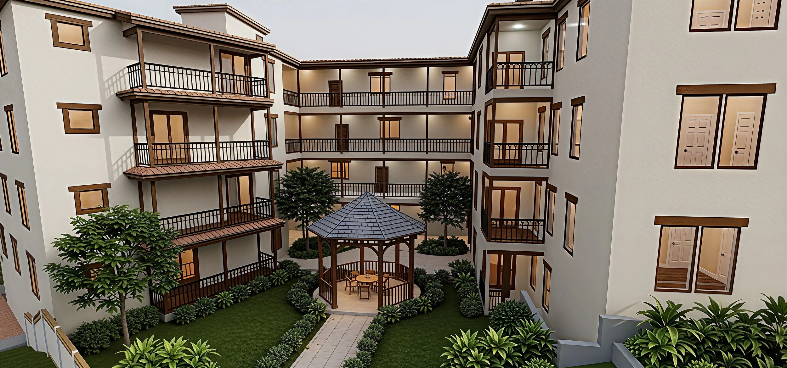 I took the design inspiration from the famous El Rancho Hotel in Gallup, New Mexico. It is a classic hacienda approach with porches, courtyards, eclectic materials, blended with a mandatory concrete and glass storefront look on the lower two levels.